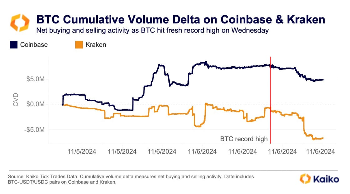 Looking at cumulative volume delta (CVD), which measures net buying and selling activity, it was negative on the exchange as prices soared—while Coinbase was positive, signaling heavy net buying. On Kraken, for instance, prices never broke $75.4k during the initial rally, amid heavy selling pressure.