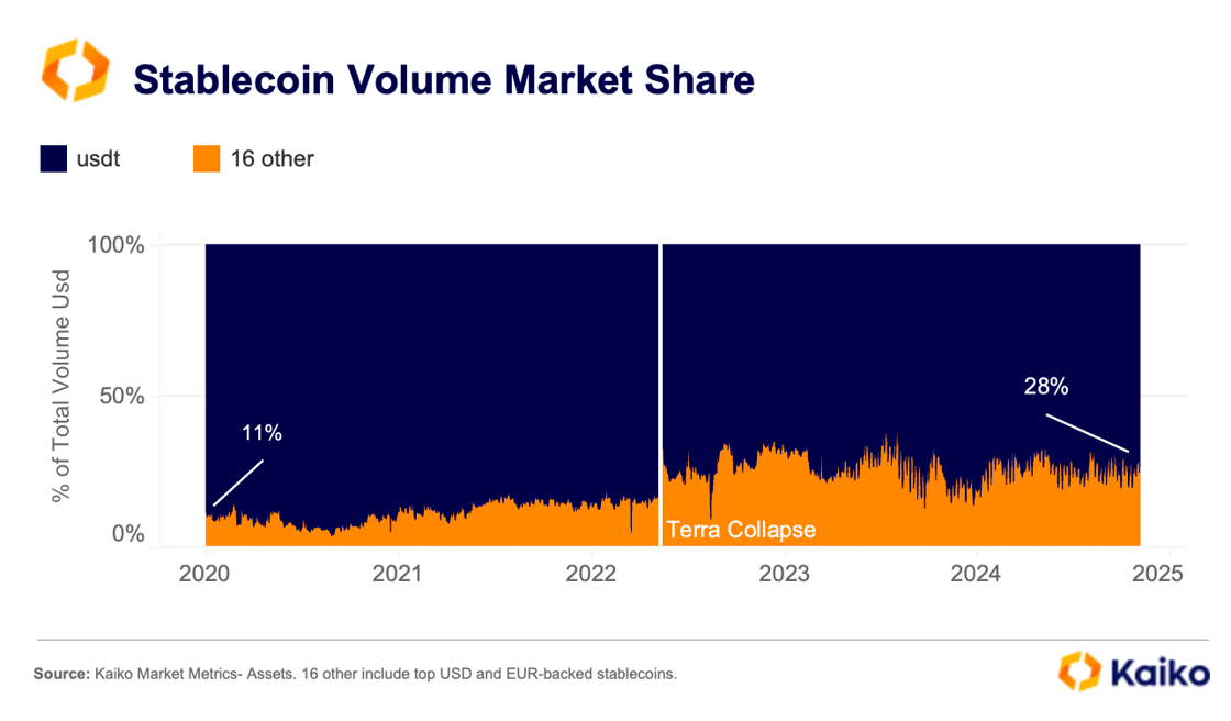 Meanwhile, competition between stablecoins has risen on both centralized and decentralized platforms. On centralized exchanges, USDT still leads with 72% of stablecoin volume, but regulated alternatives like Circle's USDC and EURC have gained traction since the Terra collapse in 2022. Conversely, on decentralized exchanges, USDC’s market share has declined since the 2023 U.S. banking turmoil, while USDT has gained ground on major DEXs like Uniswap.