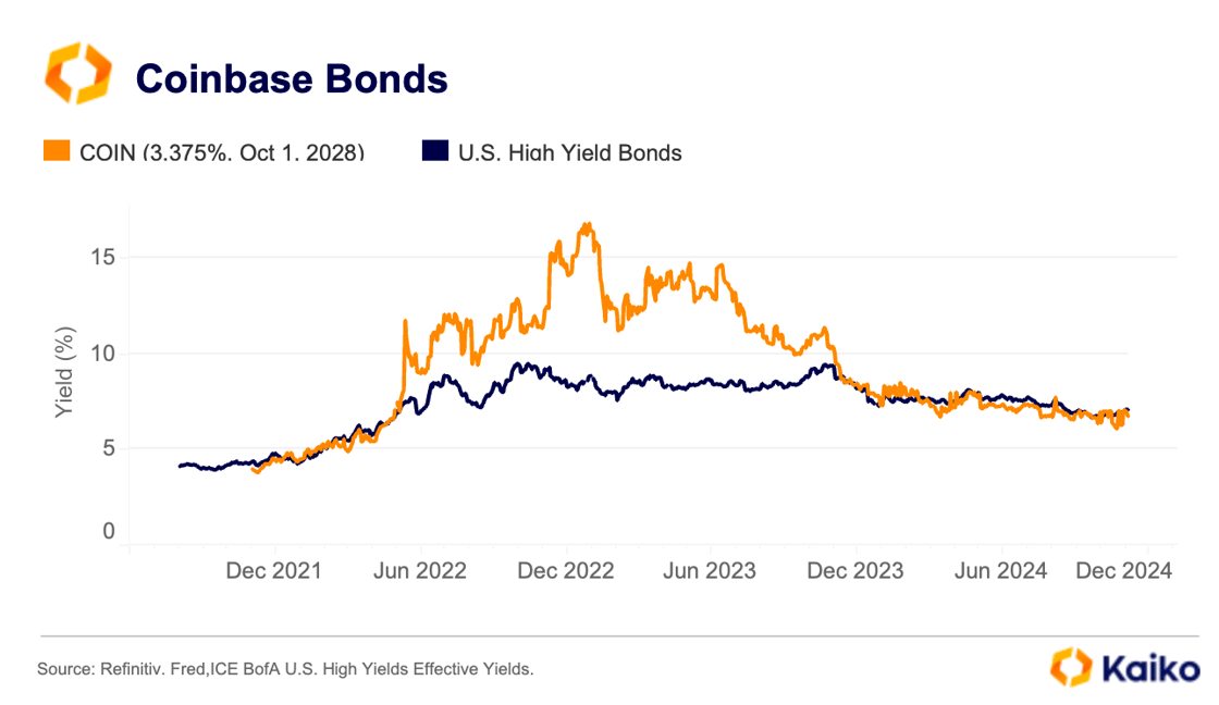 Overall, Coinbase bond yields have nearly halved following an ETF-driven rally in late 2023. Previously, these yields were about 4% higher than U.S. high-yield bonds but now sit slightly below, suggesting a more optimistic longer-term market outlook for the crypto industry.