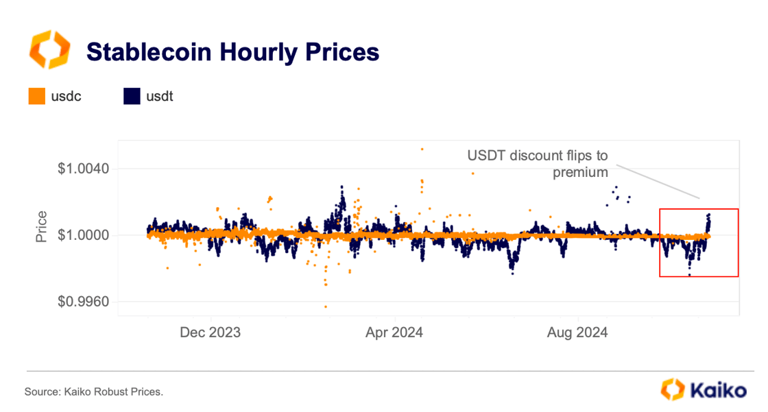 Stablecoins, particularly Tether's USDT, also saw unusual volatility last week. Within 24 hours, USDT flipped from trading at a discount to a premium against the USD. The move was spurred by strong buying on both U.S. and offshore exchanges and suggests that traders might be moving into stablecoins in anticipation of further market gains. Interestingly, however, USDT’s main competitor, Circle’s USDC, didn’t see a similar spike and instead traded at a slight discount to the USD. This discrepancy may stem from differences in redemption models and user bases.