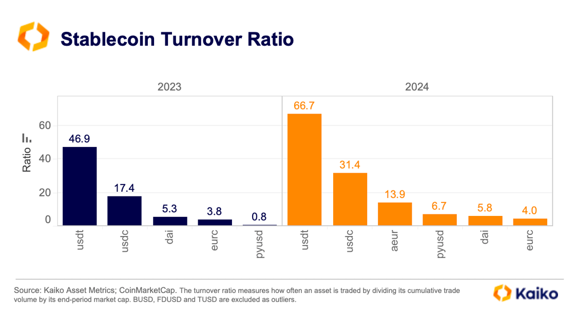 The use of stablecoins as a medium of exchange has also surged in 2024, as reflected by a rising turnover ratio, which shows trading volume growing faster than market cap. Additionally, stablecoins are increasingly adopted in traditional financial transactions, with companies like Stripe integrating them into their payment systems.
