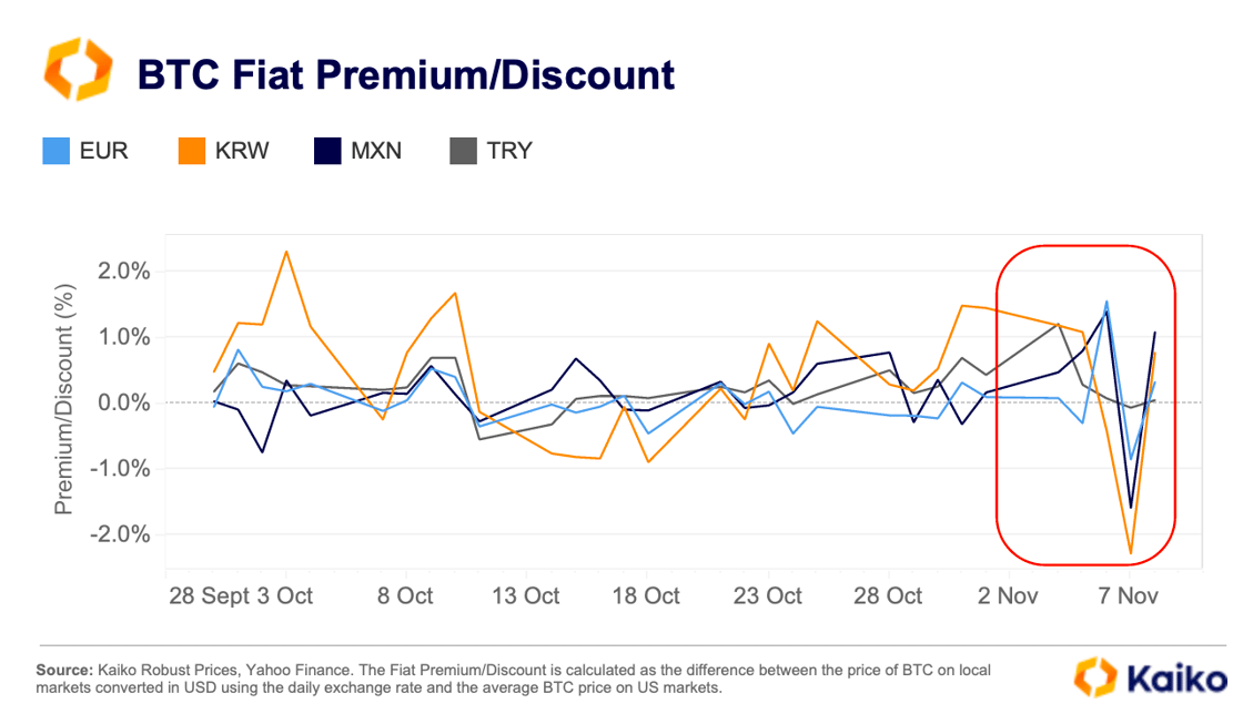 BTC trades at a discount on non-dollar fiat markets.