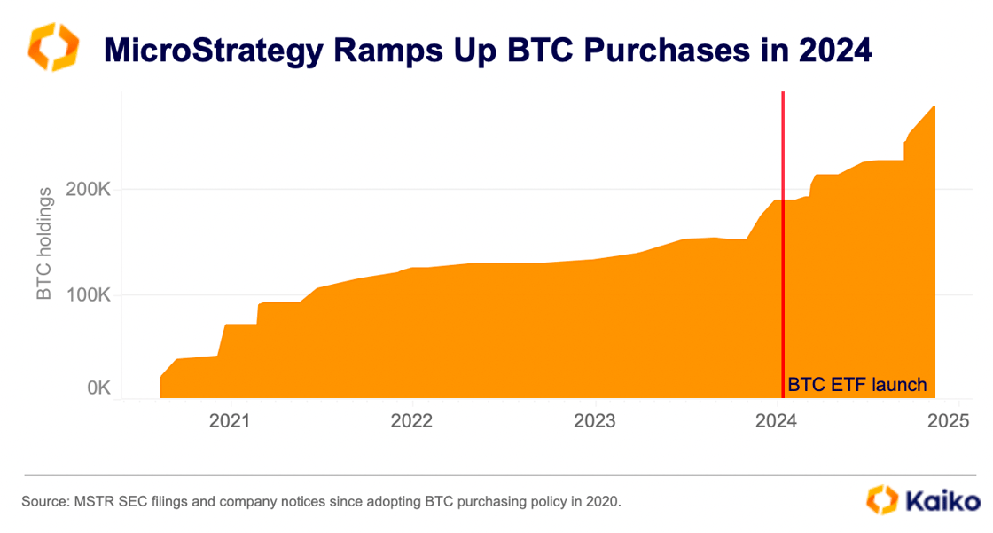 Self-described Bitcoin treasury company MicroStrategy is reaping the rewards of its bold strategy. Michael Saylor’s firm has been adding BTC to its balance sheet since August 2020, and since the launch of BTC ETFs in January, they’ve even accelerated their purchases.